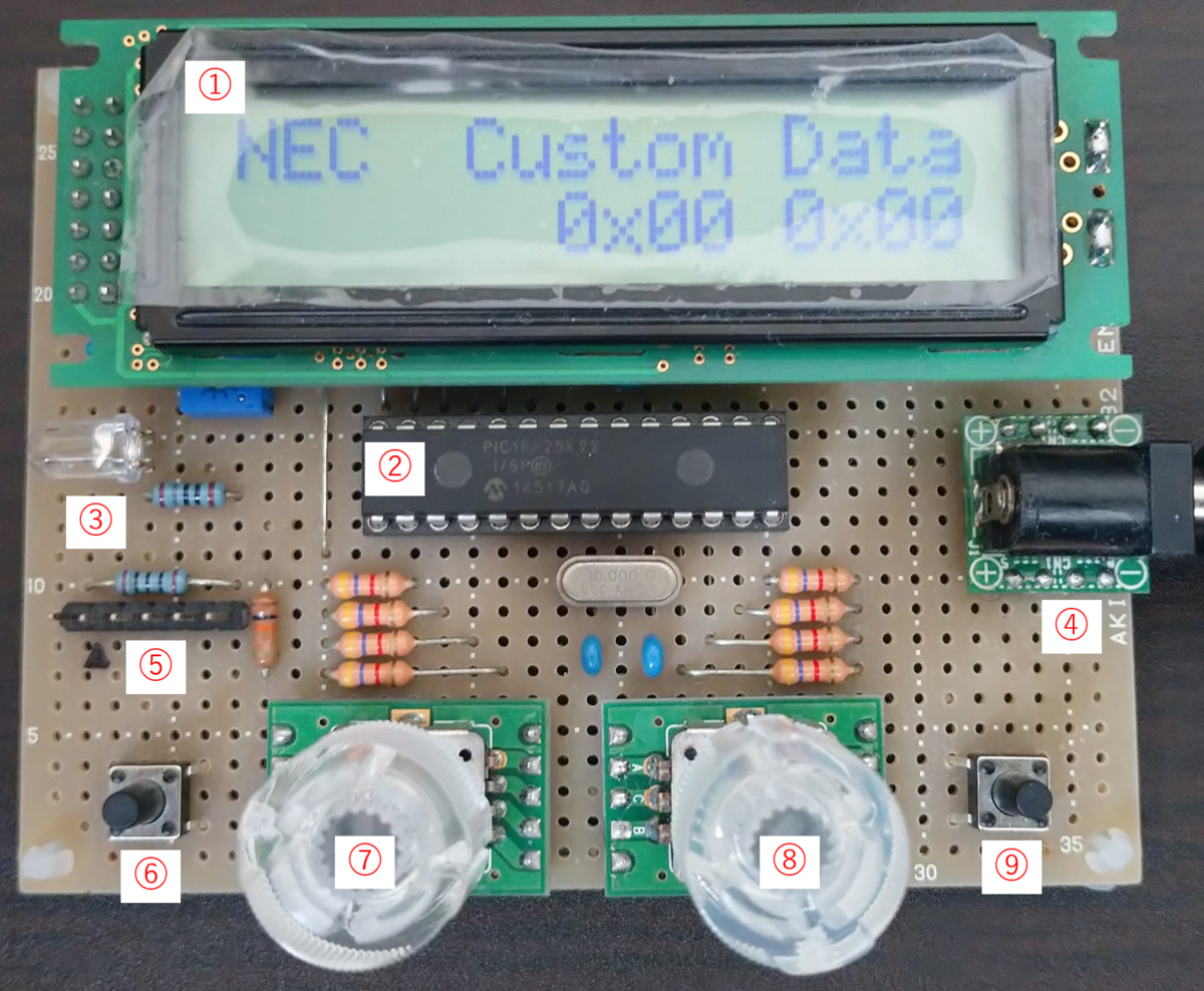 - ロータリーエンコーダーを使用してコマンドを自在に変更できる。パターンはカスタマーコード256通りとデータコード256通りの全65536通り。
