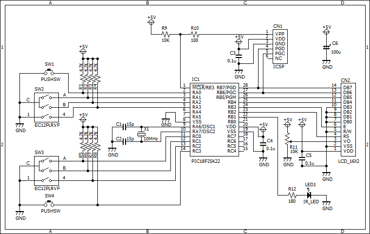 - SW1~4が操作関係で、SW2~3は押しボタン付きロータリーエンコーダーを使用。PIC18F25K22はポートB以外内部プルアップがないので、R1~8を使用してプルアップしている。本当はチャタリング防止のローパスフィルターを入れたかったが、スペースと見た目の関係で使用していない。