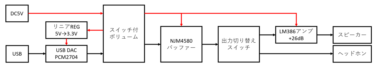電源はアンプ用の+5.0VとUSB DAC用の+3.3Vを使用する。