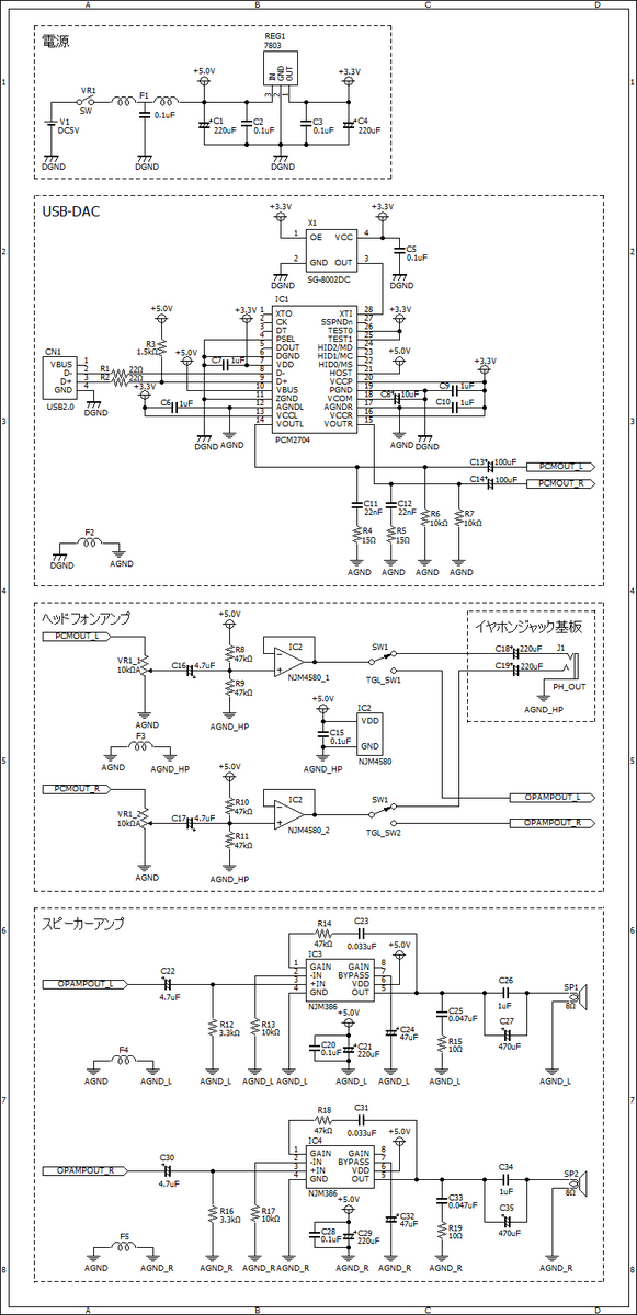 回路は大まかに分けて電源、USB DACヘッドフォンアンプ、スピーカーアンプに分かれる。