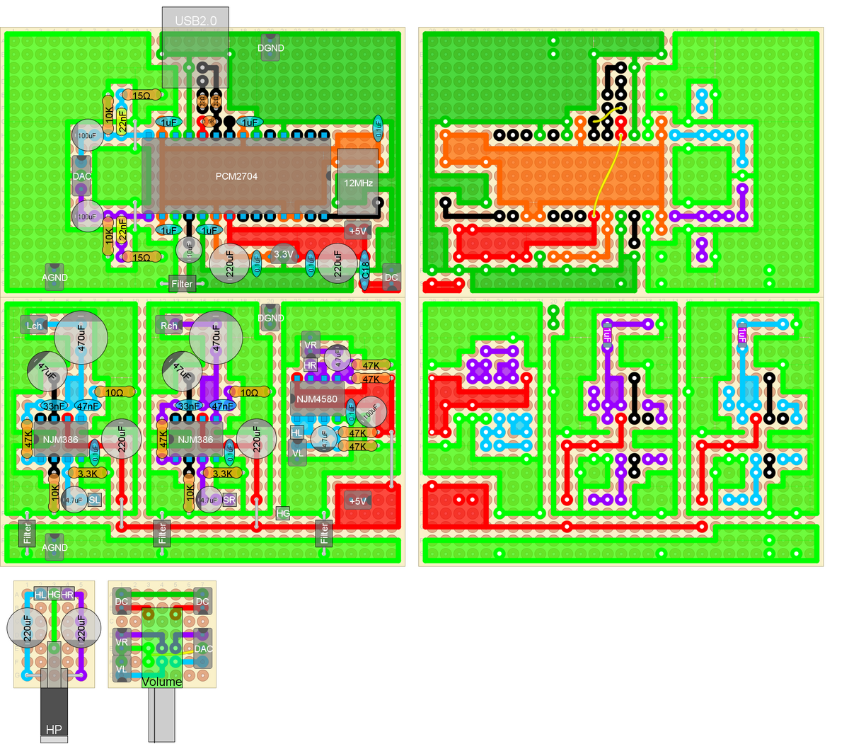 レイアウトの色分けについては、緑がDGND、黄緑がAGND各種、赤が+5.0V、オレンジが+3.3V、水色が左CH、紫が右CH、デジタルやその他が黒となっている。